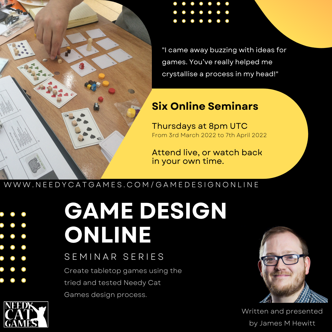 Each seminar is self-contained, so you can just dip into the ones that seem the most interesting or relevant to you. However, they are also written to be enjoyed as a full series, walking you through the whole design process one step at a time. An optional exercise is provided at the end of each seminar, giving you the chance to put your new skills into practice, and you’re invited to come along to the Needy Cat Games Discord to ask any questions and join our growing community of game designers!